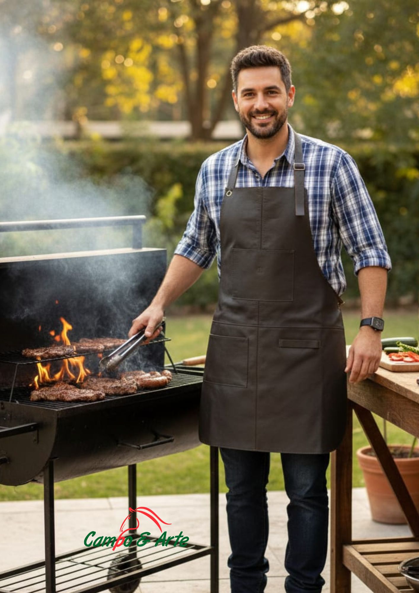 Estilo e Sofisticação: Além da funcionalidade, o avental de couro agrega um toque de autoridade e elegância ao churrasqueiro. A textura natural e as variações de tons do couro, como tabaco, mel ou preto, conferem um visual rústico e sofisticado.