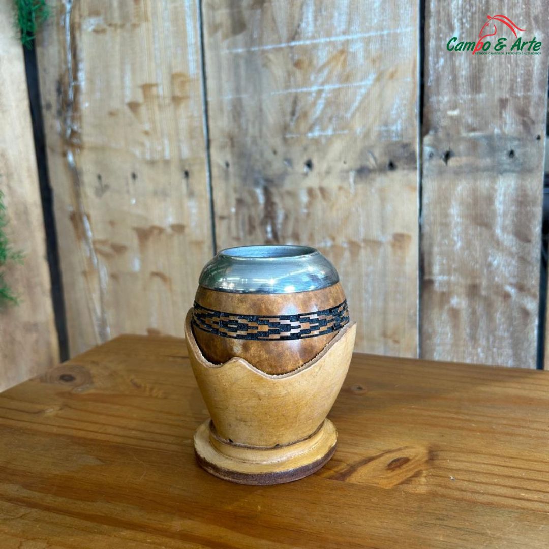Desenvolvida para os amantes de chimarrão que não abrem mão de estilo e qualidade, esta cuia "coquinho" estilo uruguaio combina a rusticidade do porongo natural com o acabamento refinado do couro e inox. A faixa temática Pampa gravada a laser confere um visual autêntico e sofisticado.