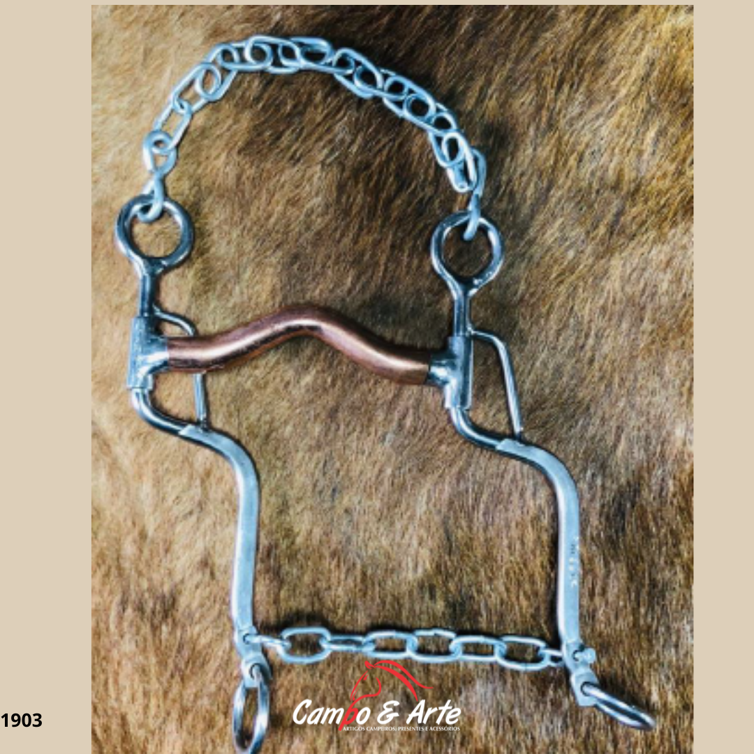 Bocal em Cobre: O bocal (assento) é revestido ou feito de cobre/bronze, um material que estimula um melhor salivamento no animal. Isso proporciona maior conforto e aceitação, resultando em um manejo mais suave e eficiente.
