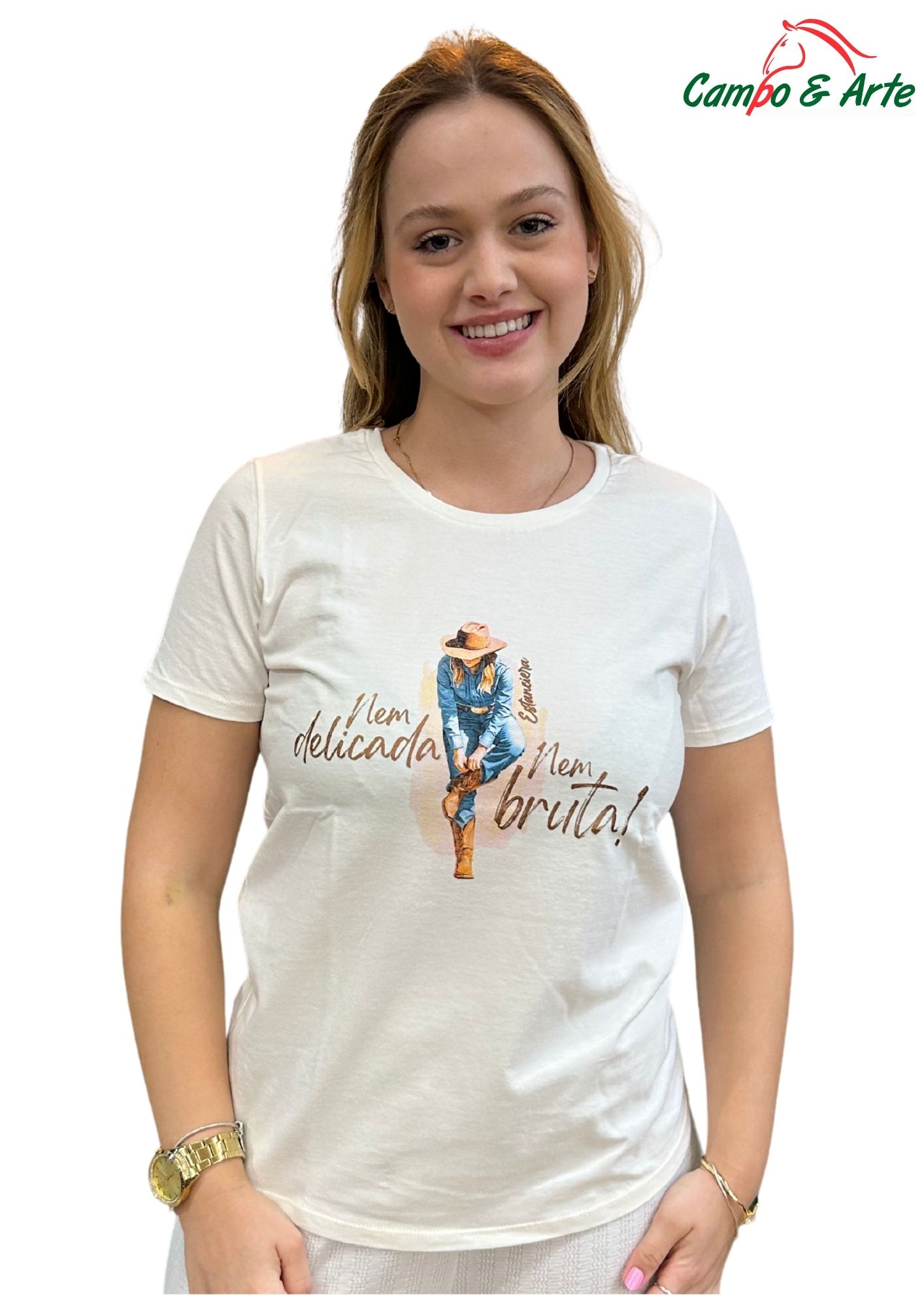 T-Shirt Feminina Essência Equestre, a peça perfeita para mulheres que têm uma paixão incondicional por cavalos, hipismo, ou simplesmente amam o charme e a sofisticação do estilo country e da vida no campo.