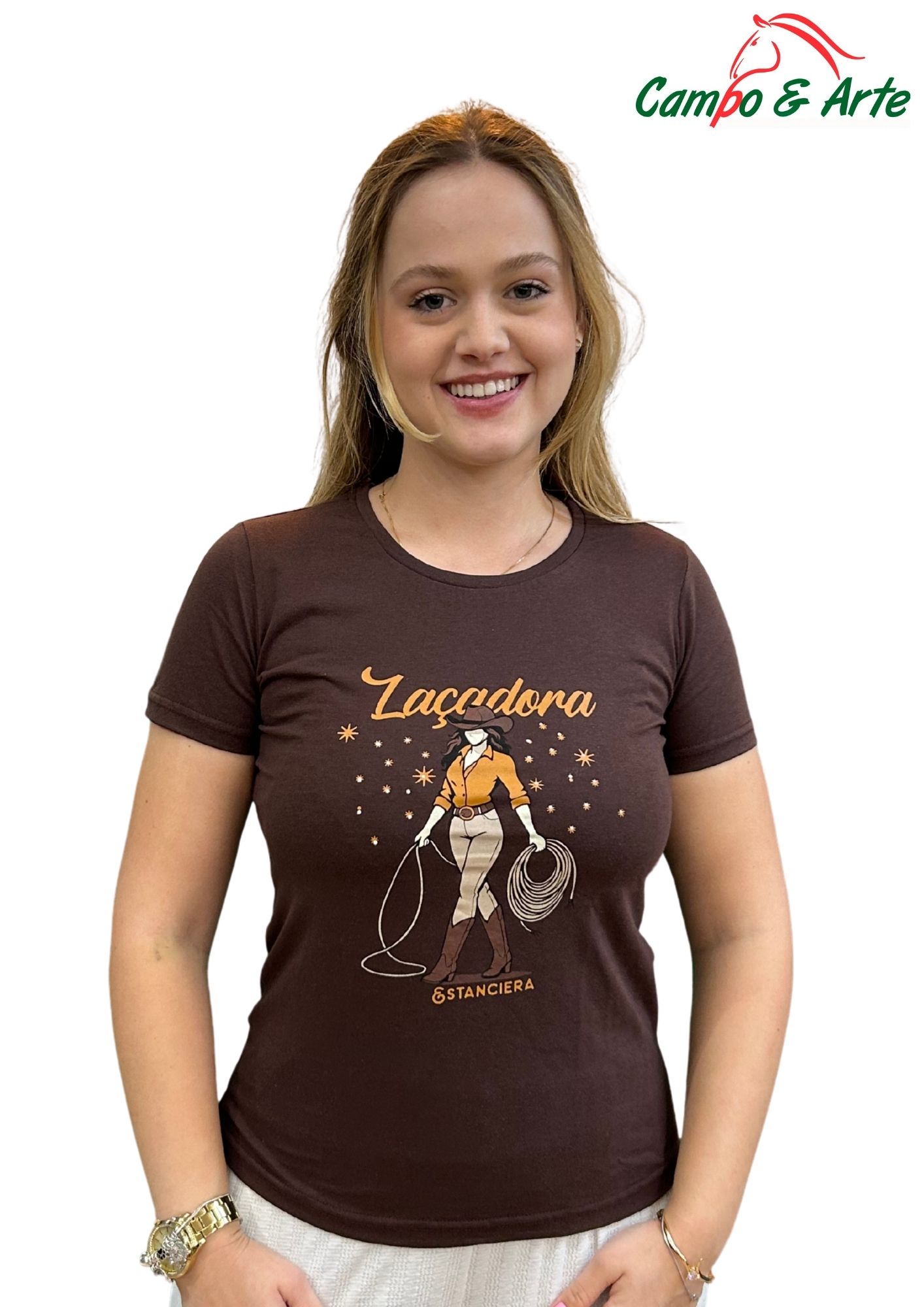 T-Shirt Feminina Essência Equestre, a peça perfeita para mulheres que têm uma paixão incondicional por cavalos, hipismo, ou simplesmente amam o charme e a sofisticação do estilo country e da vida no campo.