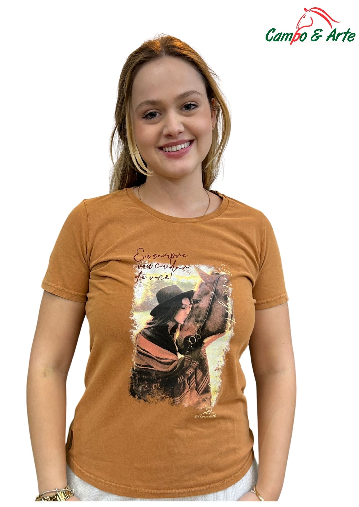Confeccionada em um tecido premium (como malha de algodão macio ou viscolycra, por exemplo), esta camiseta garante leveza, conforto e um caimento impecável para o seu dia a dia. A estampa exclusiva de um cavalo (mencionar detalhes, ex: "em tons terrosos", "com detalhes em strass", "design minimalista") é o destaque, traduzindo a força, a beleza e a liberdade do mundo equestre.